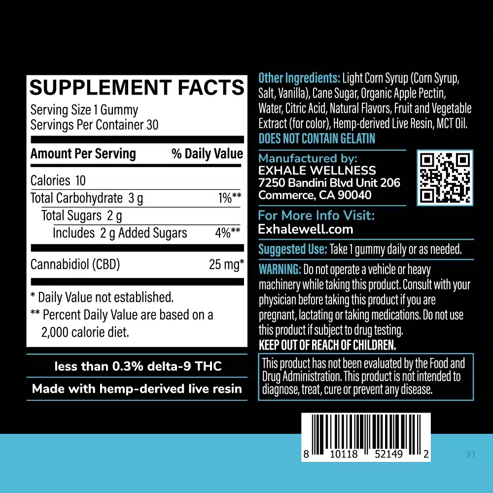 - Other Ingredients: Other Ingredients: Light Corn Syrup (Corn Syrup, Salt, Vanilla), Cane Sugar, Apple Pectin, Water, Citric Acid, Natural Flavors, Fruit and Vegetable Extract (for color), Hemp-derived Live Resin, MCT Oil.