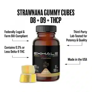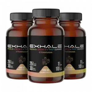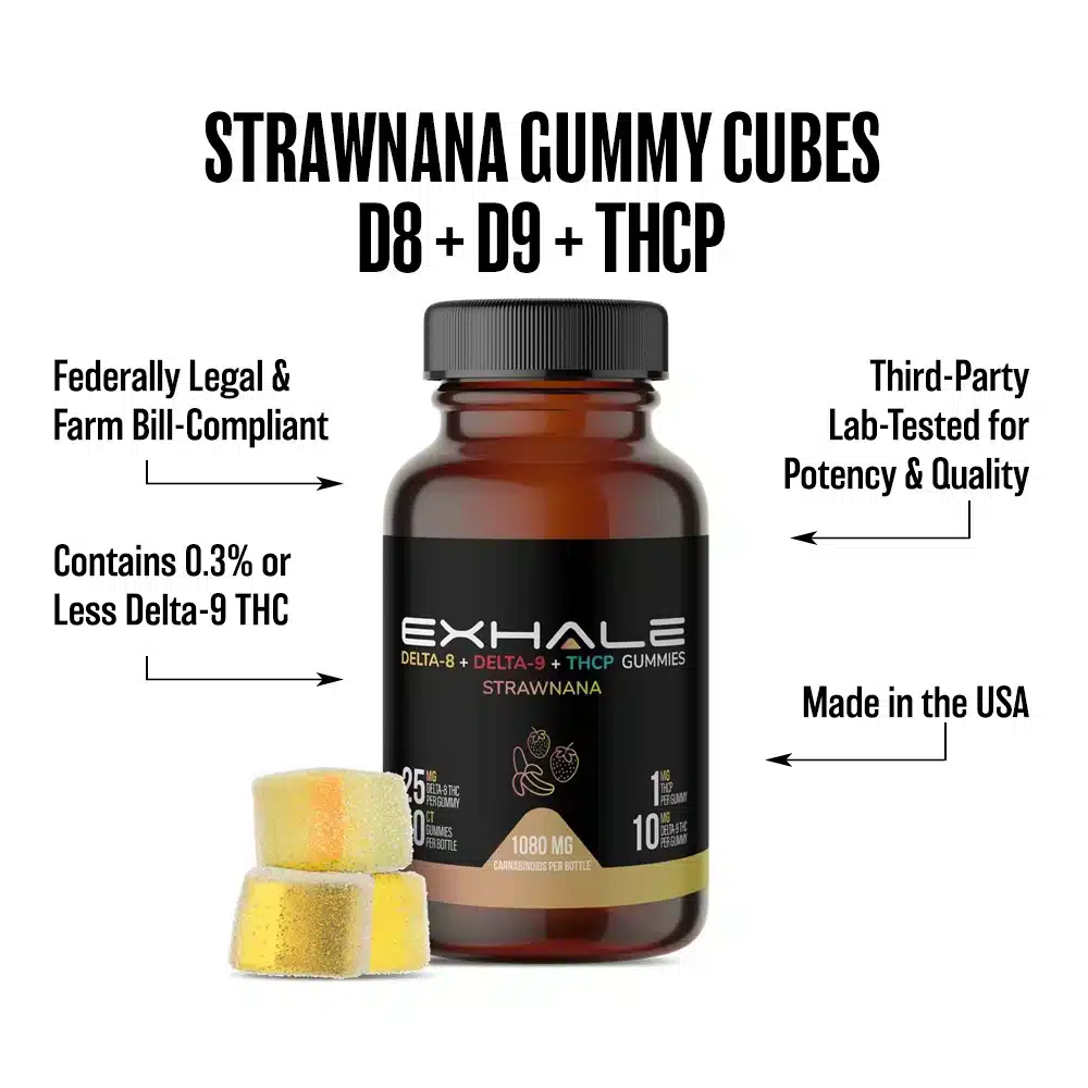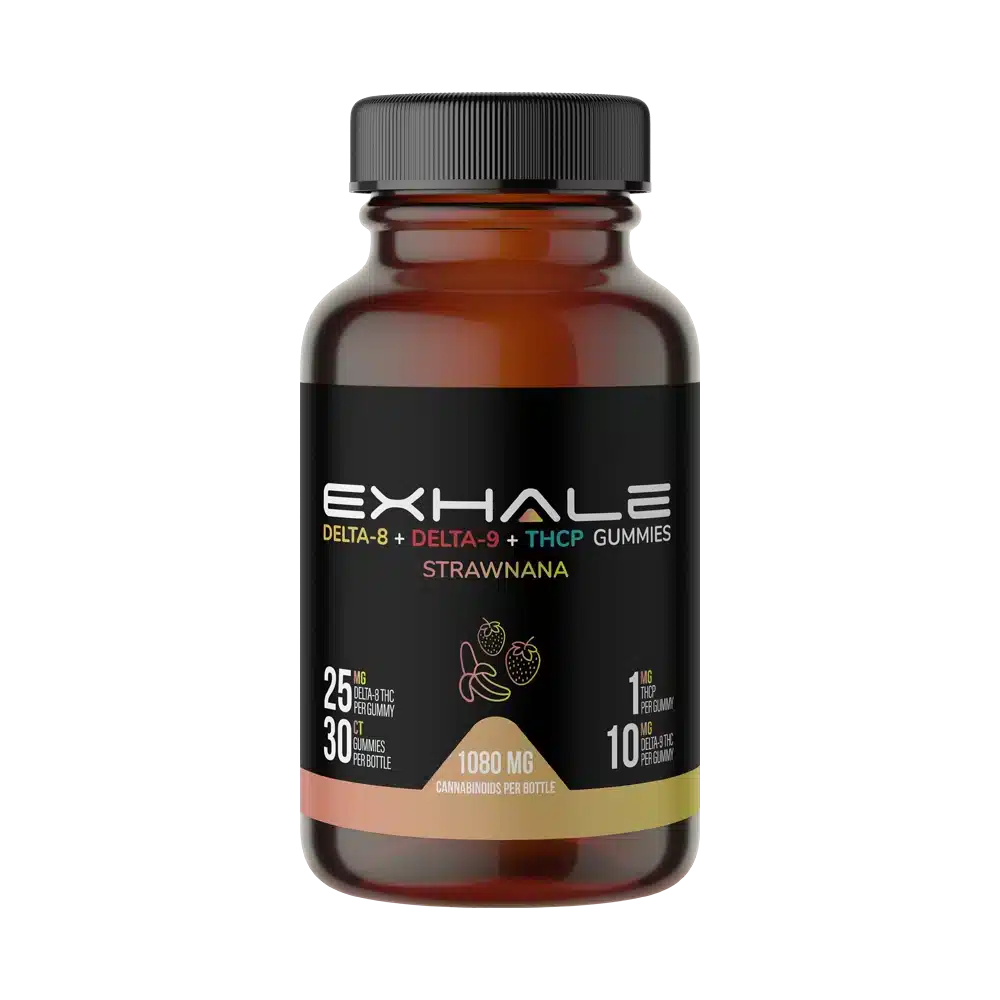 Each bottle contains 30 gummies. Infused inside every gummy is 25 mg Delta 8 THC, 10 mg Delta 9 THC, and 1 mg THCp. Our D8+D9+THCp Strawnana Gummies are completely hemp-derived and Farm Bill-compliant. They are the perfect treat for enjoying alone or sharing with friends.
