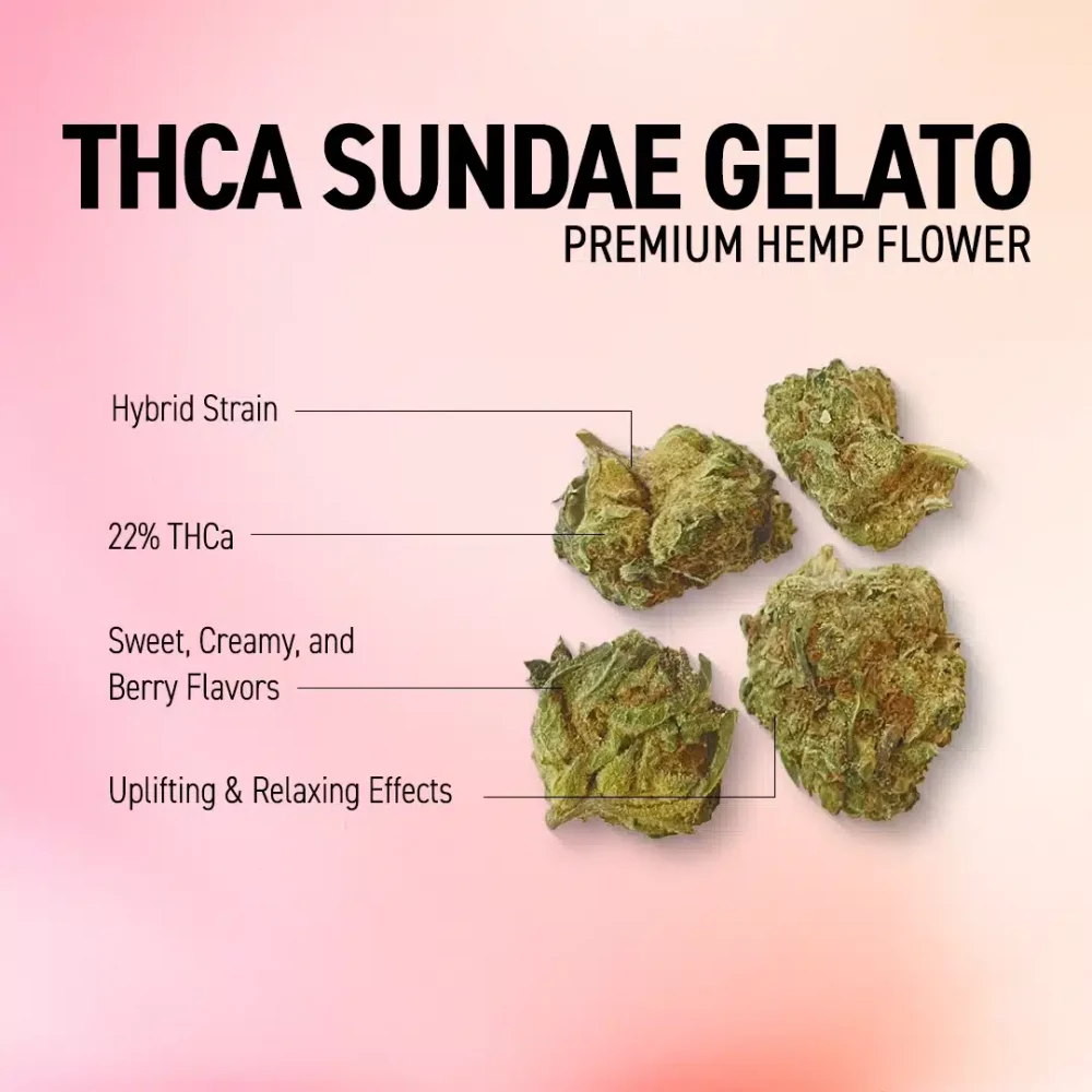 When you want a premium THCa flower that provides satisfying effects and tastes great, grab a scoop of our Sundae Gelato! While there is an air of mystery surrounding the exact lineage of this tasty strain, we can definitely recognize some Gelato traits in the smell and flavors when rolling up this flower. A true hybrid strain that is ideal for experienced hemp smokers, delivering the winning combination of potency and delicious flavor. The effects of Sundae Gelato are generally mentally uplifting and physically relaxing, making it a suitable strain for anyone wanting to relieve stress, ease their tension, and manage physical discomfort. The flavor profile is dominated by gassy and creamy notes, with hints of sweet berries on the exhale.